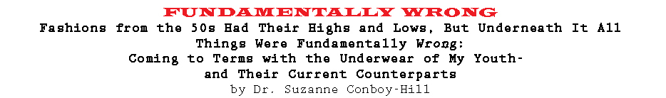So how far have we come since the days when I poured my perfectly-acceptable, fourteen-year-old form into a girdle that could only be removed with bolt cutters? Well, we stripped off practically everything meant to go under anything in the 60s, and many of us actually found that we have muscles that might be called upon to do much of the holding up and in heretofore assigned to latex and laces. But now, when trying on undies entails a trip to a miniscule dressing room with panties sized to fit an anorexic Barbie, are we really any more evolved than we were when our Mums cautioned us to don clean knickers in case we got knocked down by a car on the way to school? Who knows? All I know is that it will definitely take medics longer to free me of my underthings, should that mother-feared moment ever come to pass, than those found on most females younger than me. I can accept that, but it doesn't make it any less, well... wrong.