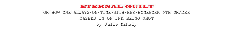 As soon as we were outdoors, Cathy Hampel started to cry. I have to admit that I was impressed. I mean, I liked JFK. He was handsome, and Jackie was beautiful, and their kids were cute and all, but it's not like any of us knew him personally, so her ability to turn on the waterworks was impressive. But then Cathy had always been a tad dramatic, and I may have been distracted by the fact I had been spared life-altering ridicule and humiliation through a serendipitously horrific and world-altering tragedy. I felt horrible- and giddy with relief.