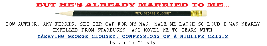 If Marrying George Clooney has any flaws they are these. It's nearly impossible to read more than a chapter without laughing out loud with unladylike volume and timbre. This makes consuming its pages a dicey public endeavor— ergo the above title mention of risking expulsion from Starbucks. And finally, dear Amy, if anyone is going to marry George Clooney it's me. I have been using personalized "Mrs. George Clooney" pencils, (example at top of page), for the last eight years, and I haven't stocked up on the scribblers for nothing. So thanks for the remarkable read, Ferris, but the man is mine.