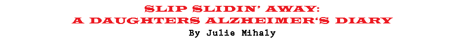 JULIE MIHALY just returned from taking her mom to the doctor. When she arrived at Mable's assisted living facility Julie opened the door of the car for Mable to get in. Mable kissed her on the lips and said, "Well, I'll see you soon," as if the two were parting ways. Julie jokingly said, "Honey, I don't think you'll get very far without me behind the wheel." Then, on the way to the doctor's, Mable asked for the first time in a way that didn't seem like a slip of the tongue, "Have you talked to Julie lately?" Sadness. But soon they were laughing. Julie tells Mable and herself that these are Buddhist blessings reminders to live in the moment.